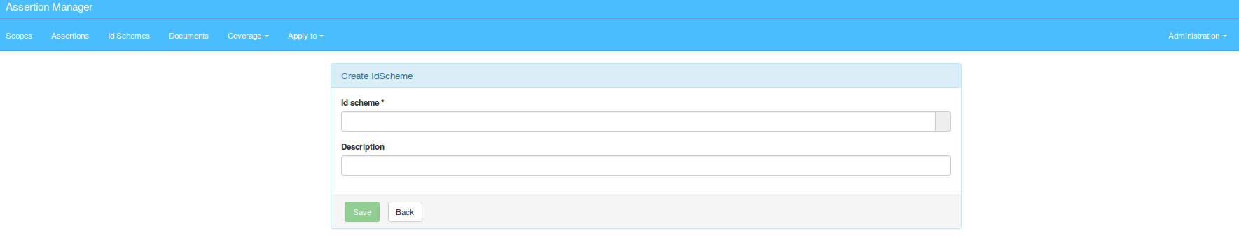 The page displayed lists all registered IdSchemes and the seach criteria area to filter according to Scope Id Scheme and/or Model-based Validator Sevice: