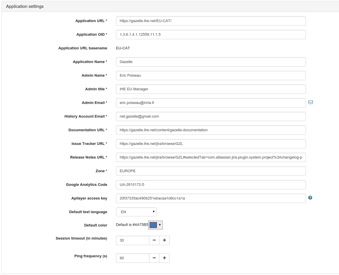 • Application URL: the URL to gazelle application (example: https://gazelle.ihe.net/EU-CAT/). This attribute is used to create permanent links into the application to the test plan, test instances, etc.