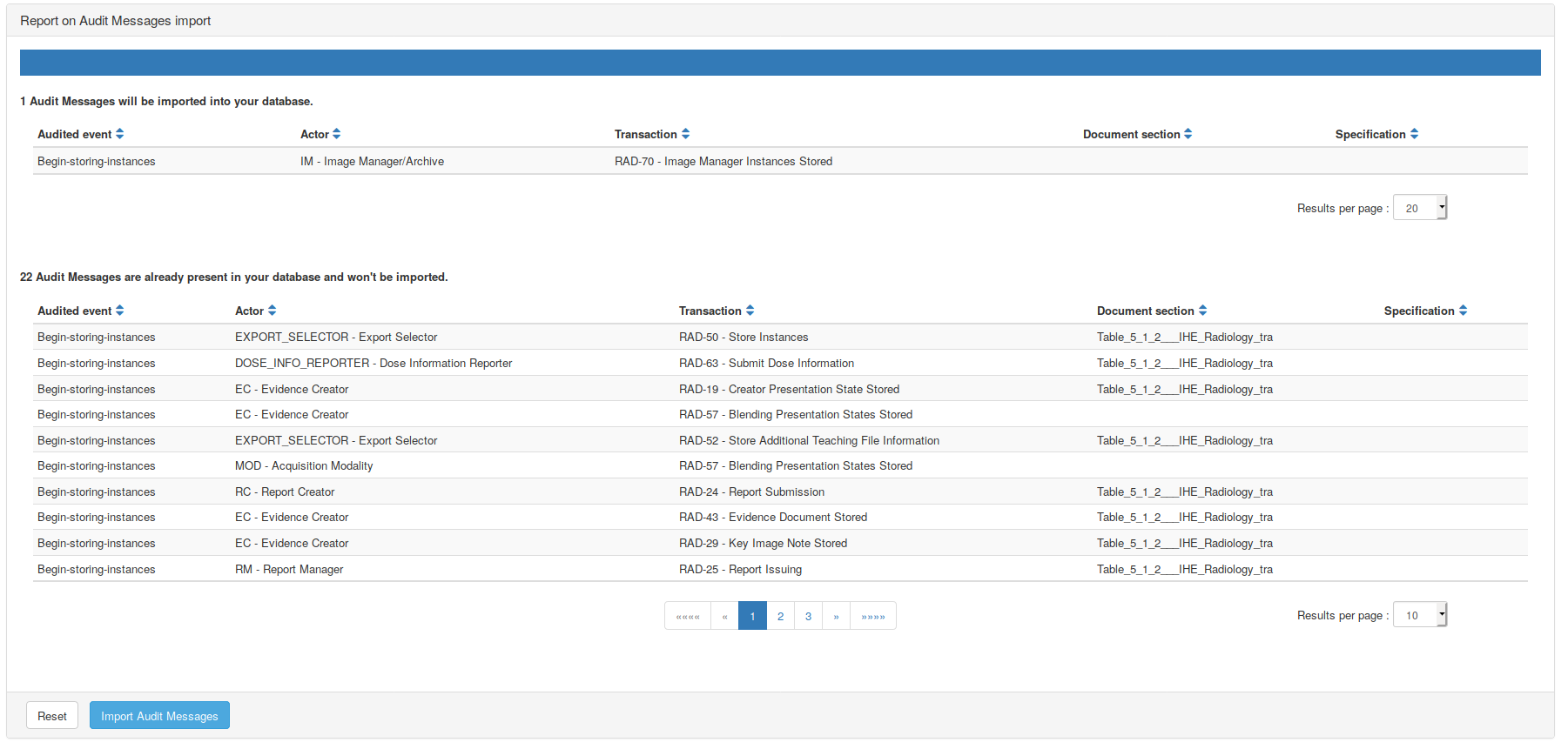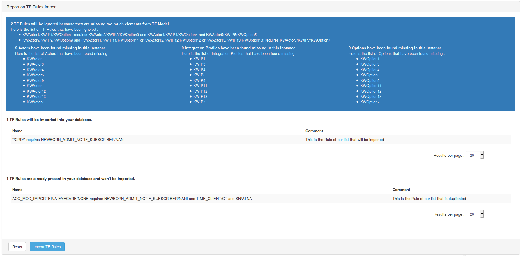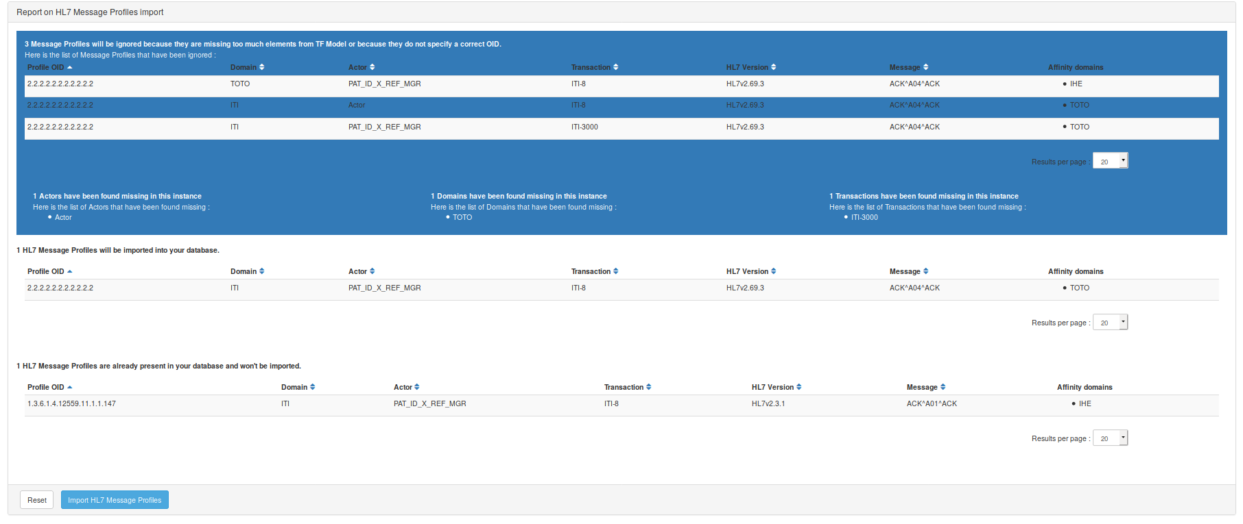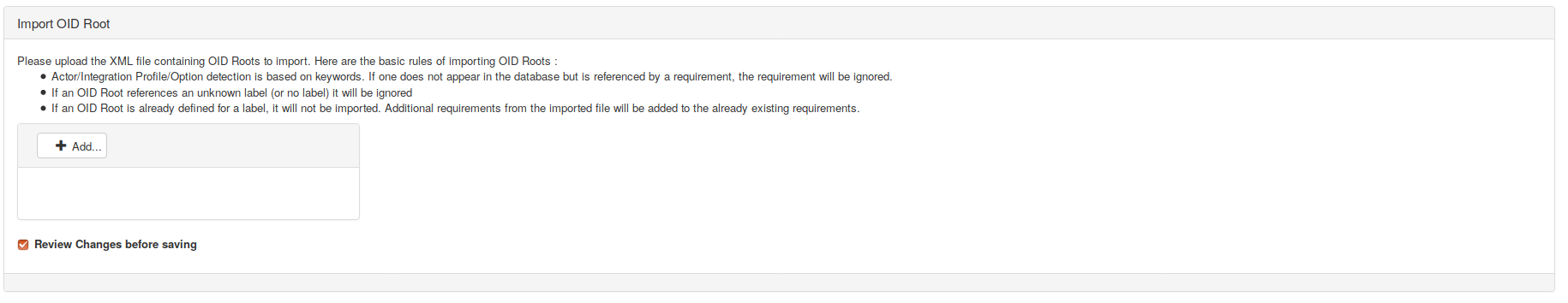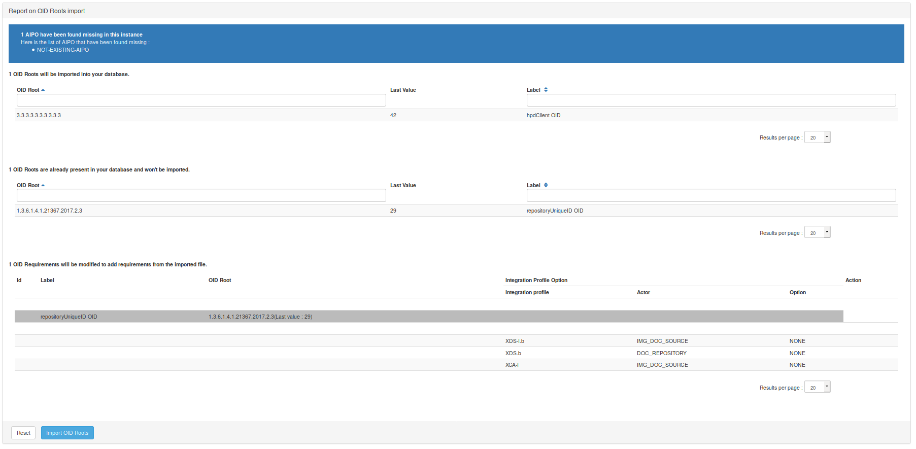 If the Review Changes before saving option is activated, simply click the Import OID Roots button on the bottom of the report to validate the changes and import them into the Gazelle Test Management instance. If something is not ok with the uploaded document, just click the Reset button. Changes will not be made on the tools data and you will be able to upload another document.