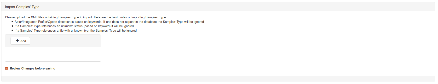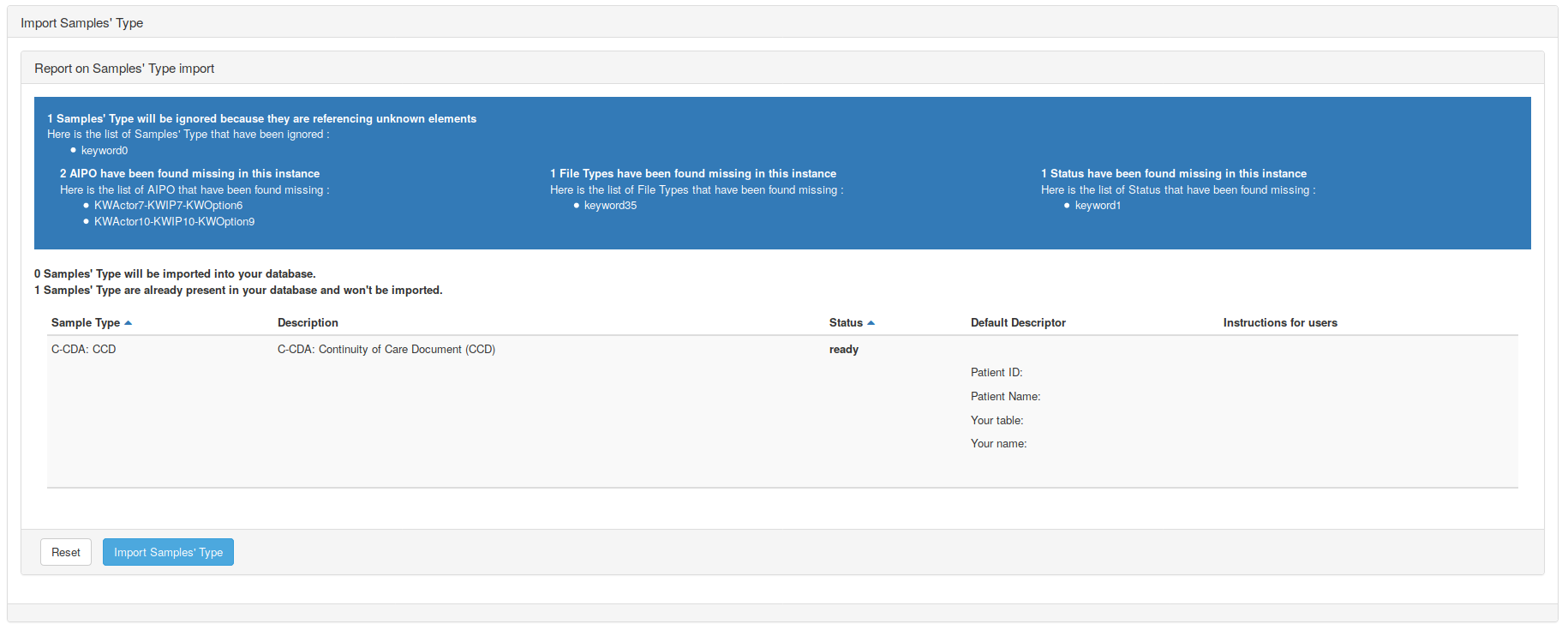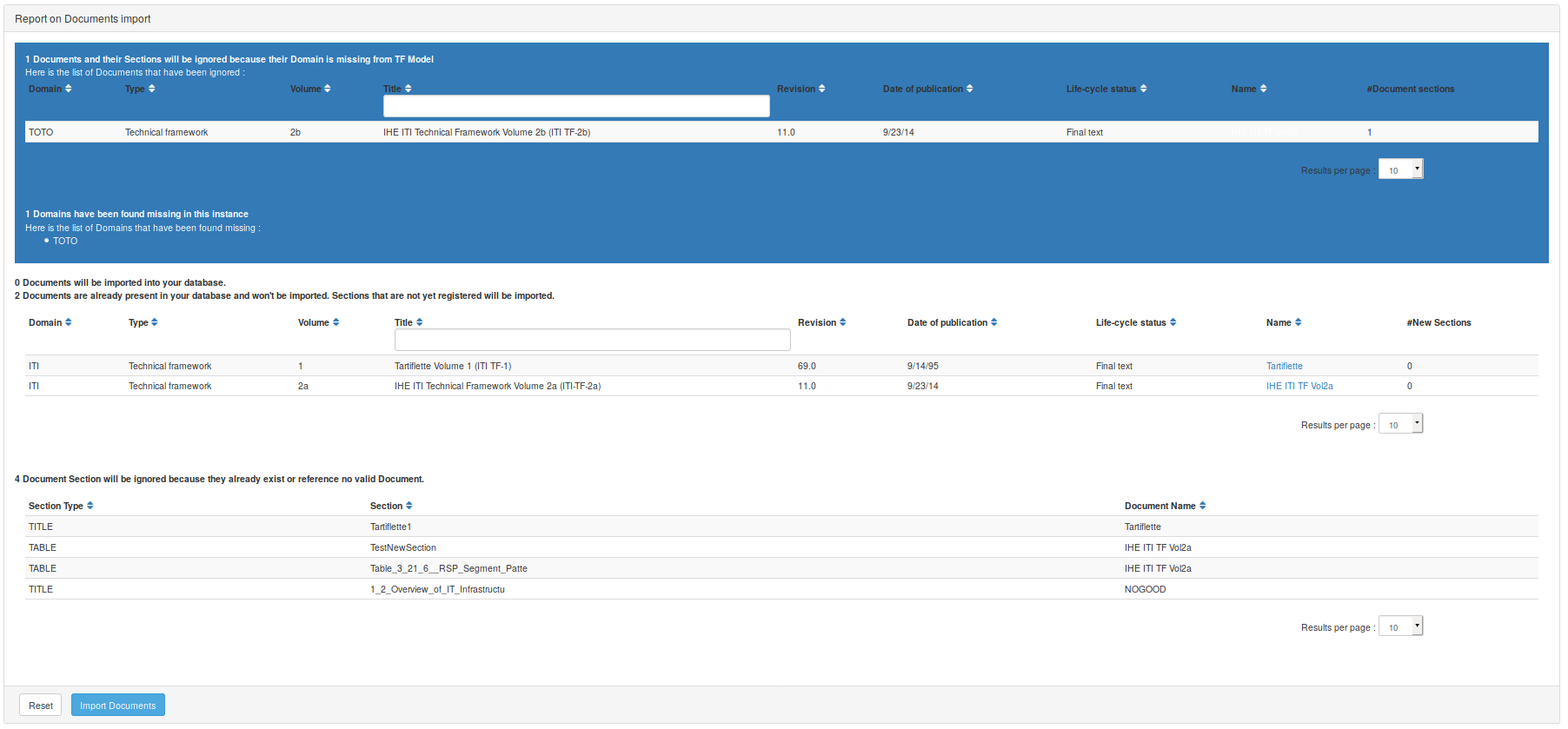 If the Review Changes before saving option is activated, simply click the Import Samples’ Type button on the bottom of the report to validate the changes and import them into the Gazelle Test Management instance. If something is not ok with the document, click the Reset button. Changes will not be made on the tools data and you will be able to upload another document.